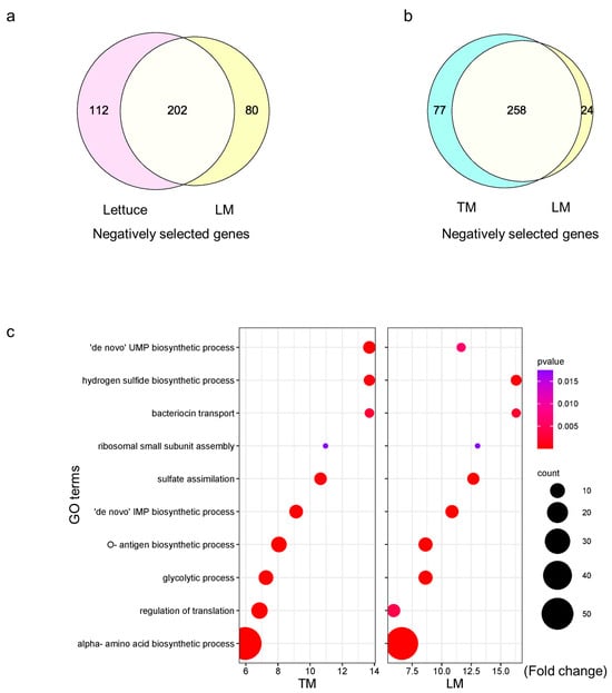 Comparison of genes essential for S. Typhimurium 14028s growth in lettuce and tomato-leaf mimicking media (LM and TM, respectively) using S. Typhimurium 14028s transposon sequencing (Tn-Seq) library approach. Three biological replicates were prepared for each experimental variant. Both output (24 hpi) and input (control) samples were sequenced. Conditionally essential genes were negatively selected by the threshold of adjusted p < 0.05 and log2 fold change < −1 using TRANSIT (version 3.2.6) Resampling tool, and were compared (a,b). Significantly enriched GO terms were determined (c). UMP: uridine 5′-monophosphate; IMP: inosine 5′-monophosphate.