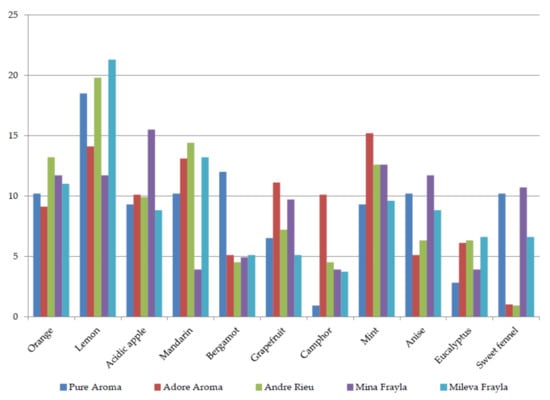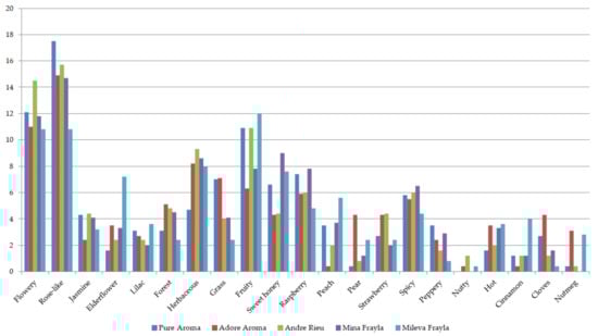 Middle notes belonging to 21 different categories showed a higher variation with only three groups reaching over the threshold of 10%—flowery(with elderflower dominant in ‘MIL’), fruity (among which raspberry and strawberry dominate) and typical rose-like notes. Spicy fragrances scored lowest, with the majority of components reaching less than 5%, while nutty and nutmeg (in a range 0–3%) can be considered as a mixed fragrance and not as a certain association with any of the investigated cultivars (Figure 3).