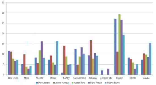 Regarding the base notes belonging to 11 different categories, eight exceeded the 10% threshold, with musky fragrance notably scored in all five cultivars (from 11.2% in ’AA’ to 29.4% in ‘AR’). Interestingly, different peaks can be noted according to Figure 4—woody fragrance in ‘MIF’, resin and vanilla in ‘MIL’, balsamic in ‘AA’, and musky in ‘PA’, ‘AR’, and ‘MIF’.