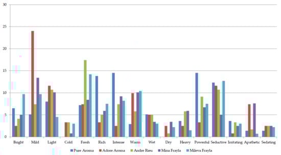 Panelists were asked to express the first emotional association upon the flower smelling, which yielded the results presented in the Figure 5. Most of the times panelists expressed association on mild in ‘AA’, fresh in ‘AR’, rich, intense, seductive, and powerful in ‘PA’ as well as fresh and seductive in ‘MIL’. Regarding ‘MIF’, associations were divided among mild, light, fresh, intense, and warm, with around 10% of the scores. Associations on cold, dry, irritating, or sedating effects were the least noted (below 5%).