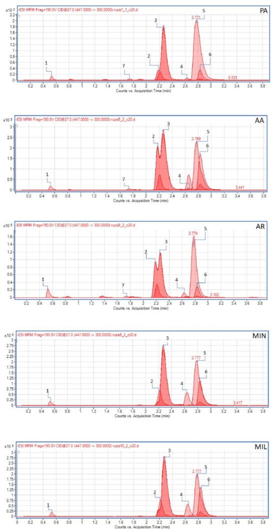 LC-MS/MS chromatograms of selected phenolic compounds in methanol extracts of rose petals.PA—Pure Aroma, AA—Adore Aroma, AR—Andre Rieu, MIN—Mina Frayla, MIL—Mileva Frayla. Only the most pronounces peaks are marked: 1—Quinic acid, 2—Quercetin-3-O-galactoside, 3—Quercetin-3-O-Glucoside, 4—Rutin, 5—Quercitrin, 6—Kaempferol-3-O-Glucoside, 7—p-Coumaric acid.