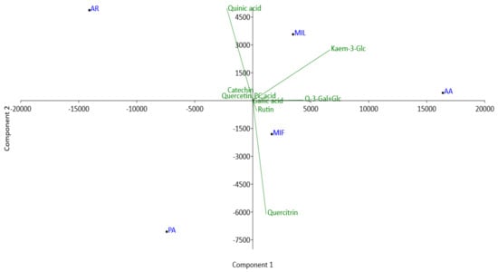 Biplot of a principal component analysis (PC1 vs PC2) analysis of 10 dominant compounds in rose petal methanol extracts. AA—‘Adore Aroma’; AR—‘Andre Rieu’; MIF—‘Mina Frayla’; MIL—‘Mileva Frayla’; PA—‘Pure Aroma’.