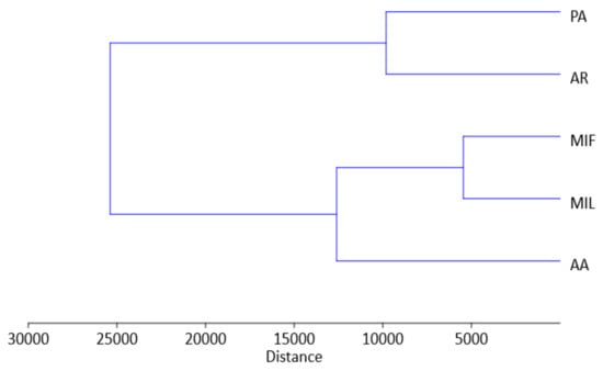 Dendrogram obtained using hierarchical clustering analysis of 10 dominant compounds in rose petal methanol extracts. AA—‘Adore Aroma’; AR—‘Andre Rieu’; MIF—‘Mina Frayla’; MIL—‘Mileva Frayla’; PA—‘Pure Aroma’.