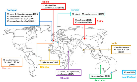 M. ciceri and M. mediterraneum are widespread across numerous countries, including Spain, Portugal, Morocco, Tunisia, and India (as depicted in Figure 1). However, their presence is conspicuously absent in China, where instead, M. muleiense and M. wenxiniae have been discovered and identified [87,89,90,94,95]. Notably, M. muleiense exhibits a broader distribution in the Xinjiang, Gansu, and Ningxia regions of northwestern China [9,87,89,94,95], whereas M. wenxiniae is restricted to Gansu Province [90]. When chickpeas are introduced into a new region lacking native chickpea rhizobia, it becomes imperative to inoculate specific rhizobia during the introduction and planting process [96]. Remarkably, in China, none of the globally prevalent chickpea rhizobia, such as M. ciceri, have been detected [9]. This absence suggests a long history of chickpea introduction in China, leading to the emergence of unique Chinese chickpea rhizobial species through the planting process. During this time, rhizobia may have been co-transported with chickpea seeds, potentially allowing native Chinese rhizobia to acquire symbiotic capabilities from introduced chickpea rhizobia or even evolve directly to nodulate with chickpeas through co-evolutionary processes [87,96].