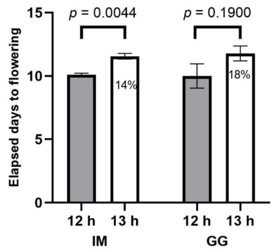 Elapsed days to flowering (EDTF) responses to 12 h (filled bars) and 13 h (empty bars) photoperiod treatments of C. sativa cultivars ‘Incredible Milk’ (IM) and ‘Gorilla Glue’ (GG). Data are means ± SE, n = 3. Error bars are presented for all data but may be obscured for small SE values. Percentage values marked in the 13 h bars signify the increase in EDTF relative to the 12 h treatment, and the p-values above each cultivar represent the significance level of the comparison of means according to Student’s t-test.