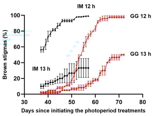 The initiation of flowering of IM was delayed in the 13 h treatment by approximately 1.5 d, but there were no photoperiod treatment effects on EDTF in GG (Figure 1). However, the rate of early inflorescence development appeared to be slightly delayed in the 13 h treatment in both cultivars (Figure 2). Stigma browning was substantially delayed in the 13 h treatment in both cultivars (Figure 3).