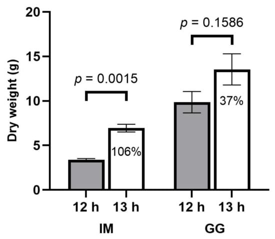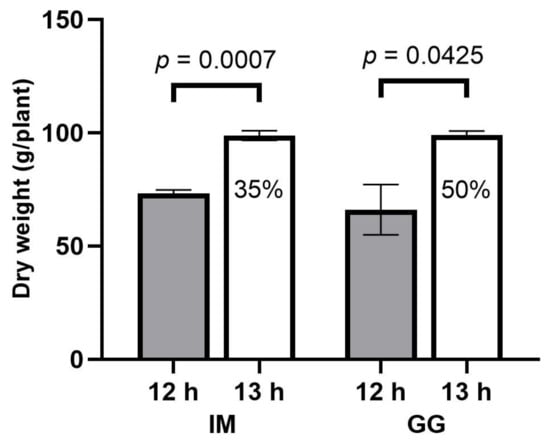 The total inflorescence DW was 35% higher in IM and 50% higher in GG in the 13 h vs. 12 h treatments (Figure 7).