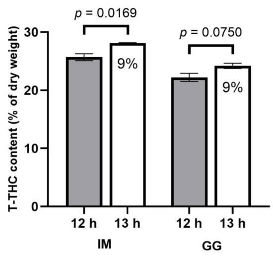 Total equivalent THC (T-THC) concentrations (% of dry weight) in the apical inflorescence responses to 12 h (filled bars) and 13 h (empty bars) photoperiod treatments of C. sativa cultivars, ‘Incredible Milk’ (IM) and ‘Gorilla Glue’ (GG). Data are based on the loss-on-drying determinations of the water content of the sampled tissues. Data are means ± SE, n = 3. Error bars are presented for all data but may be obscured for small SE values. Percentage values marked in the 13 h bars signify the increase in T-THC relative to the 12 h treatment, and the p-values above each cultivar represent the significance level of the comparison of means according to Student’s t-test.