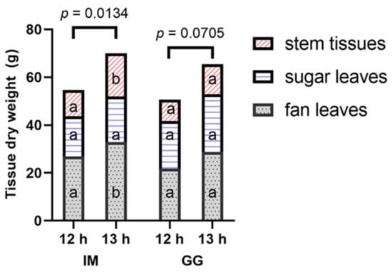Dry weight (mean, n = 3) of aboveground vegetative tissues from individual plants under 12 h and 13 h photoperiod treatments in C. sativa cultivars ‘Incredible Milk’ (IM) and ‘Gorilla Glue’ (GG). Tissues are separated into stems (diagonal pink lines), sugar leaves (horizontal blue lines), and fan leaves (gray dotted pattern). In each cultivar and each tissue type, photoperiod treatments bearing the same lowercase letter are not significantly different at p ≤ 0.05 according to Student’s t-test. The p-values above each cultivar represent the significance level of the comparison of the total aboveground vegetative DW according to Student’s t-test.