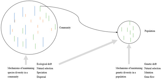 Before discussing genetic conservation under the community ecology framework, we examine how the evolutionary processes at the community level affect species diversity and the genetic diversity of a tree species at the population level. Here, we first describe the effects of community processes on species diversity, which helps to understand the role of a tree species and its interaction with other species in a forest community. We emphasize the interactions between trees and other plant species at the same trophic level. Interactions between trees and other organisms at different trophic levels, including birds, mammals, insects, and microorganisms, may also affect tree species diversity and genetic diversity in a forest community [60]. These effects are not concentrated. We then discuss the maintenance of genetic diversity under two levels (population and community) of evolutionary processes.