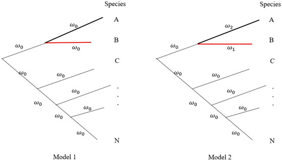 The second step is to screen interspecific interaction for tree species in different forest communities. Various methods have been proposed to test species associations [117], such as the method based on species presence/absence data among quadrats [118] or the chi-square test using contingency tables [119]. Cavender-Bares et al. [34] reviewed species competitive interaction as a mechanism for phylogenetic relatedness. Here, we concentrate on the question of how to detect molecular mechanisms underlying interspecific interactions. Using multiple orthologous gene sequences among species in a community, we can construct a community-specific phylogenetic tree. We then design different hypotheses to test selection on the branch of a given tree species. For instance, a branch model may be set to test the relative selection pressure for the interspecific species in a forest community. Figure 3 shows a hypothetical phylogenetic tree of a forest community. Suppose species B is the tree species of interest, and species A is its closely related species with interaction. We may set the branch model in the PAML (phylogenetic analysis by maximum likelihood) program [120] to detect ω () and evaluate the relative selection pressure on different branches. For instance, two models are assumed in Figure 3. The logarithm of likelihood ratio test (LRT), , is applied to test whether the interacted species have significantly natural selection or not. With the analyses of multiple ecological communities, the change of ω on the branch of the target tree species signals different selection pressures or the difference of the target tree species interacting with different species across communities.