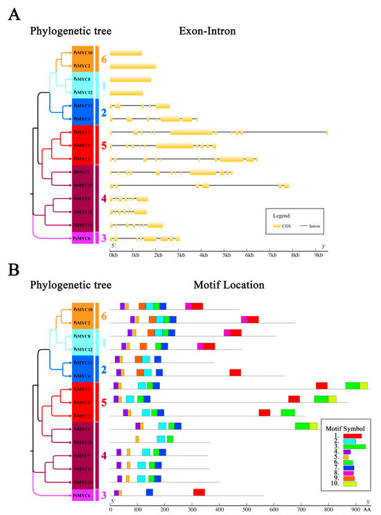 Gene structures and conserved motifs of the PsMYC proteins. (A) Gene structure analysis of the PsMYC proteins. In the phylogenetic tree, different colors represent different groups of the PsMYC proteins. In the exon–intron distribution, the black lines represent introns, and the yellow boxes represent the coding sequences. The horizontal value represents a gene length from 5′ to 3′. (B) Conserved motif analysis of the PsMYC proteins. In the phylogenetic tree, different colors represent different groups of the PsMYC proteins. In a motif location, different motif numbers are marked by different color boxes. The horizontal value represents a gene length from 5′ to 3′.