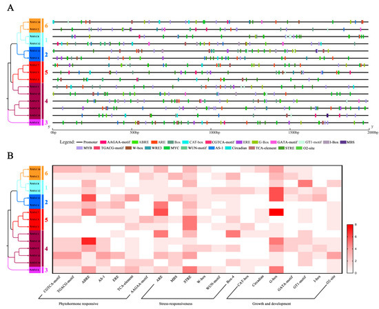The Cis-regulatory element (CRE) analysis of PsMYC gene promoters. (A) The locations of CREs in the 15 PsMYC gene promoters. The black lines represent the 2 kb promoter regions, and the different color boxes correspond with the different kinds of CREs. The horizontal values represent the promoter length. (B) A heatmap of CREs in the 15 PsMYC gene promoters. The different boxes indicate the number of CREs in different PsMYC gene promoters. The white boxes represented no corresponding CRE, and the red boxes represent eight corresponding CREs. In the phylogenetic tree, different colors represent different groups of the PsMYC proteins.