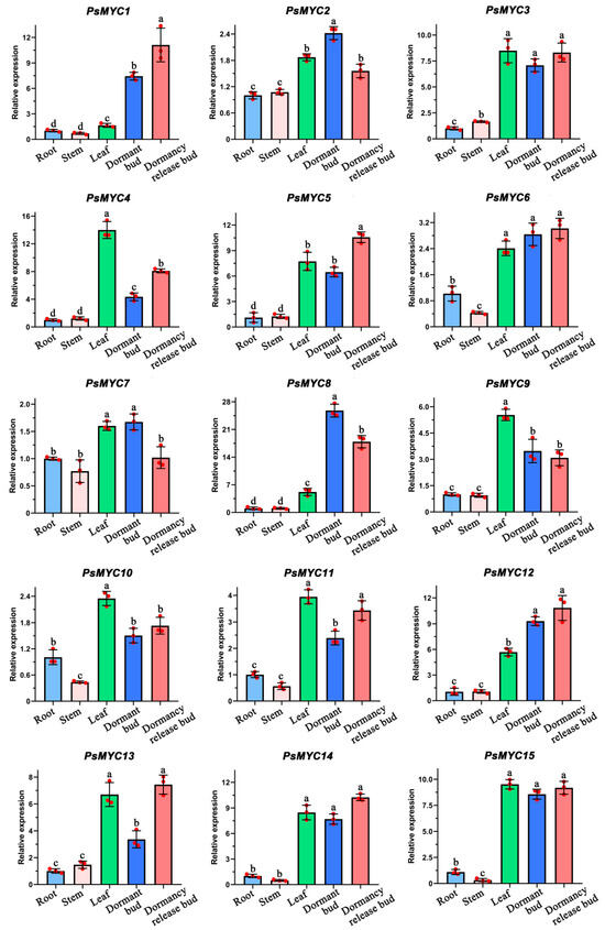 The expression patterns of PsMYCs in different tissues. Means ± SDs, n = 3, p < 0.05. Letters represent the expression significance of the PsMYCs.