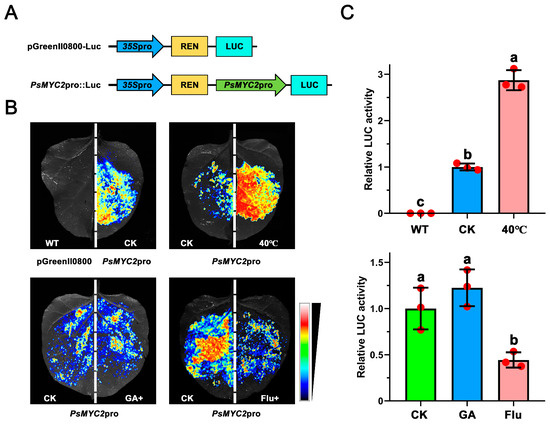The PsMYC2 promoter was inserted into a pGreenII 0800-Luc vector, and a transient luciferase assay was performed to investigate the promoter activity under different treatments (Figure 7). The results show that the luciferase signal intensity of PsMYC2pro::Luc was decreased under exogenous Flu treatment. However, compared to the control (CK), the signal intensity had no obvious difference under the exogenous GA3 treatment. These results indicate the important role of PsMYC2 in an ABA-mediated growth and development process. In addition, the promoter activity of PsMYC2 was obviously activated by high temperature, suggesting the role of PsMYC2 in the high-temperature stress response.
