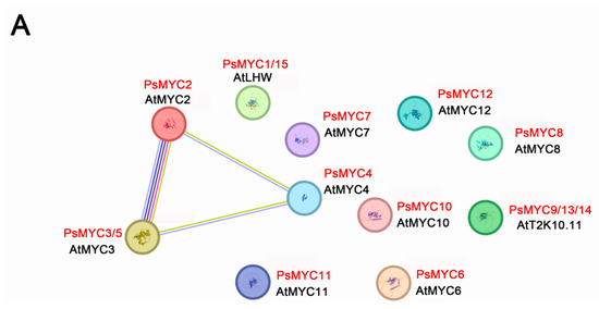 In order to enhance comprehension on the potential interactions between PsMYCs and other proteins, the online software SRING v11.5 (https://cn.string-db.org/, accessed on 2 November 2023) was employed to construct a protein interaction network map. The method and organism selected were the “amino acid sequence of PsMYCs and “Arabidopsis”, respectively, while default parameters were utilized for the remaining aspects. Ultimately, the protein interaction network map was created by selecting the most similar A. thaliana proteins based on the bit score and E-value.