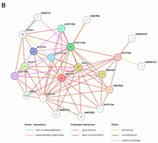 The prediction of the MYC protein interactions network. (A) Protein interaction network diagram of 15 PsMYC proteins. (B) Protein interaction network diagram of PsMYC2 proteins. Predicted protein interaction network map of PsMYC2 with other proteins in A. thaliana. Each node represents a corresponding protein, and the different colored lines indicate the type of evidence of protein interactions.