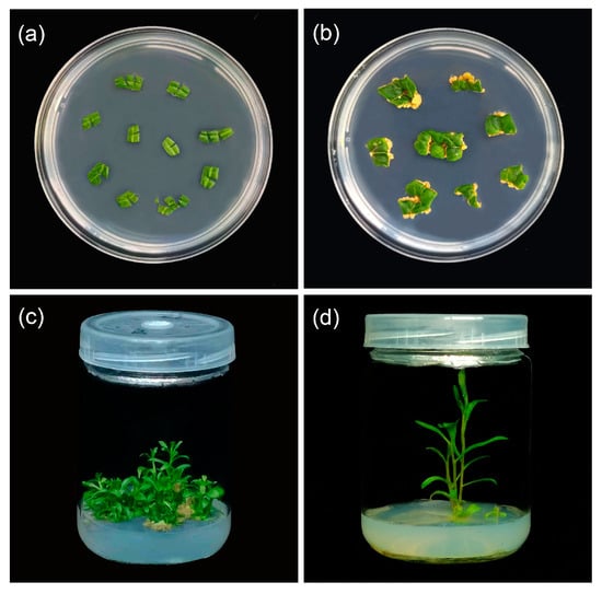 Plant regeneration from leaf explants of L. chinense: (a) the leaves were transferred to MS differentiation medium with different concentrations of growth regulators; (b) a callus has appeared at the incision; (c) the leaves successfully regenerated adventitious shoots after 50 days; (d) the adventitious buds have rooted.