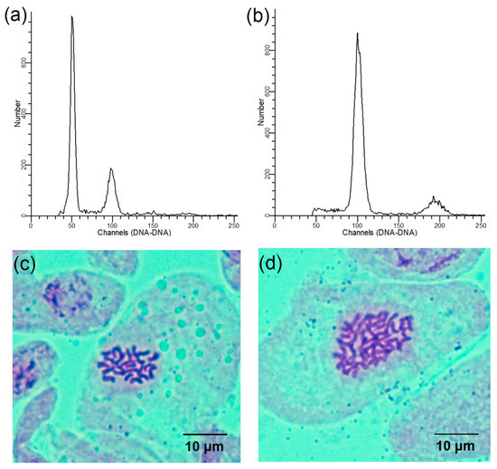 Using the diploids as a control, the ploidy levels of all regenerated plants were ascertained using flow cytometry. The peak of the control appeared at the 50 channel and the peak of the tetraploids appeared at the 100 channel (Figure 2a,b). Chromosome counts from the stem tips validated the flow cytometry analysis results. Further, cytological analysis revealed that the chromosome number in the diploid plants was 2n = 2x = 24 (Figure 2c) and 2n = 4x = 48 in the tetraploid plants (Figure 2d).