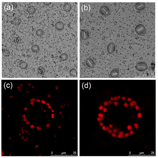 To observe stomatal characteristics, samples from the lower epidermis of 3–4 mature leaves, proceeding apically downward from both diploid and tetraploid plants, were extracted. These were positioned on slides with distilled water and observed under a light microscope at 400× magnification. From each leaf, ten fields of view were selected at random for observation of stomatal density. Subsequently, in each field of view, thirty stomata were randomly selected for stomatal size measurement. The number of chloroplasts between two guard cells in each stomatal pore was also observed by laser confocal microscopy (Leica TCS SP8 CARS, Leica Biosystems, Wetzlar, Germany). Ten stomata per leaf were randomly selected and used for chloroplast count.