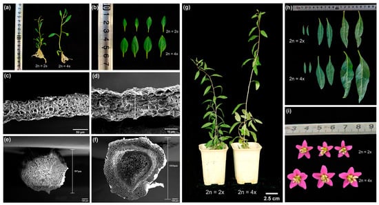 Both diploid and tetraploid plants were observed for growth traits after 30 days of growth on a rooting medium (Figure S1). There was no significant difference in plant height between the two groups (Figure 4a). However, substantial differences were noted in the growth characteristics of their leaves. Tetraploids showed significantly greater leaf length, width, and area compared to the diploids (Figure 4b). Leaf and stem thickness for both ploidy plants were examined using scanning electron microscopy (Figure 4c–f), revealing that tetraploids visibly possessed thicker leaves and more robust stems than diploids. Following 60 days of growth, both the fresh and dry weights of the whole plants and 10 leaves from the two ploidy plants were assessed. Although tetraploids had a significantly higher fresh weight for both whole plants and leaves, the weight difference was not significant after drying (Figure S2).