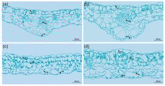 Cross-sectional anatomical characteristics of diploid and tetraploid leaves of L. chinense: (a) anatomical structure of diploid leaf vein; (b) anatomical structure of tetraploid leaf vein; (c) anatomy of the diploid leaf; (d) anatomy of the tetraploid leaf. Ue, upper epidermis; Le, lower epidermis; Xy, xylem; Pt, palisade tissue; St, spongy tissue.
