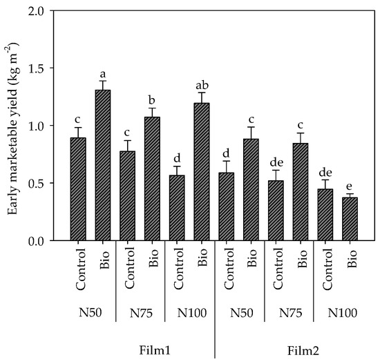 The early production decreased in N100 in Film1, while it did not significantly change with the N rate under Film2 (Figure 2). The application of the biostimulants increased the early marketable yield under both the covers and at all the nitrogen fertilization levels, except N100 in Film2, where no differences emerged compared to the untreated control. The highest increment for biostimulant treatment was recorded in plants grown at N100 under Film1 (Figure 2).