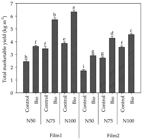 The total marketable yield was also significantly influenced by the third-degree interaction Cover film × Nitrogen dose × Biostimulant application (Figure 3). In both control plants and plants treated with biostimulant, it was higher under Film1 compared to Film2, at every nitrogen regime. Particularly, the diffusive film increased the total yield compared to the conventional clear film, with stronger effects under sub-optimal N supply (i.e., +29.4% in N50, +21.2% in N75, and +7.8% in N100 in Film1, in plants untreated with biostimulant).