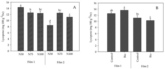 Interactions Cover film × Nitrogen dose (F × N) (A) and Cover film × Biostimulant application (F × B) (B) on lycopene content in fruits of cherry tomato grown in tunnel in spring–summer period. Mean value ± Standard error (n = 3). Different letters indicate significant differences.