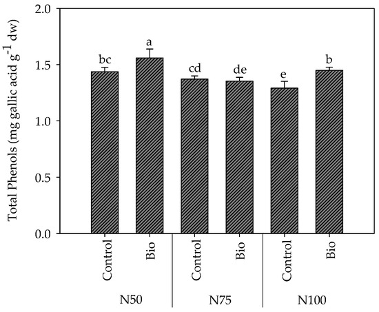 Interaction of Nitrogen dose × Biostimulant application on total phenols content in fruits of cherry tomato grown in tunnel in spring–summer period. Mean value ± Standard error (n = 3). Different letters indicate significant differences.