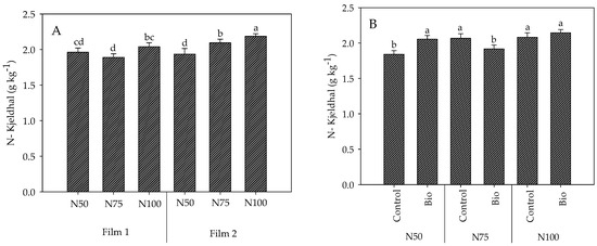 Interaction Cover film × Nitrogen dose (A) and of Nitrogen dose × Biostimulant application (B) on N-Kjeldhal content in fruits of cherry tomato grown in tunnel in spring–summer period. Mean value ± Standard error (n = 3). Different letters indicate significant differences.