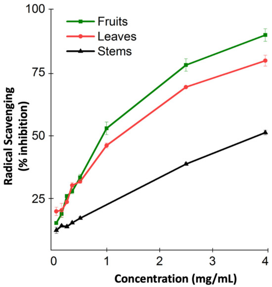 Ethanolic extracts of M. orbicularis exhibit antioxidant properties. The percentages of radical scavenging activity of different concentrations (50, 150, 250, 350, 500, 1000, 2500, and 4000 μg/mL) of leaves, fruits, and stems of M. orbicularis’ ethanolic extracts were measured by DPPH radical scavenging assay. Data are presented as the mean ± SEM of three independent experiments (n = 3).