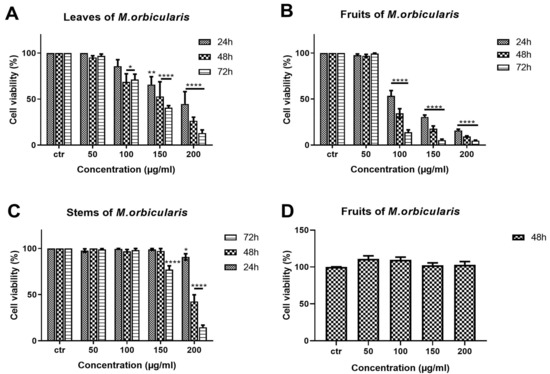 M. orbicularis’ plant parts’ ethanolic extracts reduce the viability of A549 cells. MTT assay was used to measure cell viability of A549 cells treated for 24, 48, and 72 h with increasing concentrations (50, 100, 150, 200 μg/mL) of M. orbicularis’ plant parts’ ethanolic extracts. (A–C) show the results of MTT cell cytotoxicity assay of A549 cells treated with the indicated concentrations of ethanolic plant extracts of M. orbicularis leaves, fruits, and stems, respectively. (D) shows the cell viability of neonatal fibroblast cells treated with the indicated concentrations of M. orbicularis’ fruits’ ethanolic extract. Viability of treated cells was compared to the control-(ctr) vehicle-treated cells. Data are displayed as the mean ± SEM of three independent experiments (n = 3). * p < 0.05, ** p < 0.01, and **** p < 0.0001.