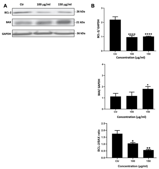To assess whether M. orbicularis reduced the viability of A549 cells by inducing apoptosis, A549 cells were treated with M. orbicularis fruit extracts for 48 h. Protein lysates were subjected to Western blotting to evaluate the protein levels of the anti-apoptotic protein BCL-2 and the pro-apoptotic protein BAX, hallmark proteins of apoptosis. Figure 3 shows a significant decrease (p < 0.001) in the protein levels of BCL-2 in A549 cells treated with 100 and 150 μg/mL of M. orbicularis fruit extracts. BAX levels decreased after treating A549 cells with both 100 and 150 μg/mL of M. orbicularis fruit extracts, but the decrease was significant (p < 0.05) only at the concentration of 150 μg/mL (Figure 3B). The ratio of BCL-2/BAX, a ratio that determines the balance between anti- versus pro-apoptotic, was dose dependently and significantly (p < 0.05), decreased by treatment of A549 cells with 100 and 150 μg/mL of M. orbicularis fruit extracts. These results indicate that M. orbicularis’ fruit extracts may induce apoptosis in A549 cells and that apoptosis may be responsible, at least in part, for M. orbicularis-induced cell death of A549 cells.