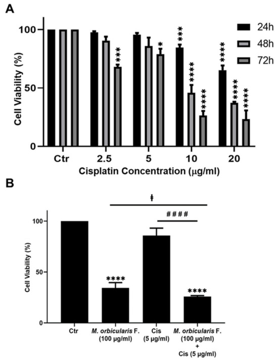 M. orbicularis enhance cisplatin-induced cytotoxicity in A549 lung cancer cells. (A) Cell viability of A549 cells treated with the indicated concentrations of cisplatin was measured using MTT assay. Data are displayed as % cell viability relative to control (ctr) cells. * p < 0.05, *** p < 0.001, and **** p < 0.0001 (B) A549 cells were treated with fruit extracts of M. orbicularis (100 μg/mL) alone or combined with 5 μg/mL cisplatin (Cis) for 48 h, and then assayed for cell viability using MTT assay. Bar graphs represent % cell viability relative to control (ctr) cells. Data are presented as the mean ± SEM of three independent experiments (n = 3). Significant difference from control: **** p < 0.0001; significant difference from cisplatin treatment alone: #### denotes p < 0.0001; and significant difference from M. orbicularis alone: ‡ denotes p < 0.05. M. orbicularis F. denotes M. orbicularis fruits extracts.