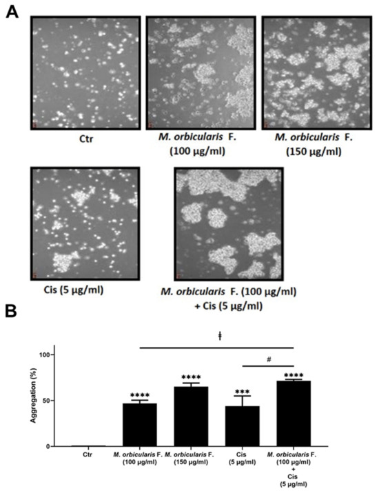 M. orbicularis augments cisplatin-induced aggregation of A549 lung cancer cells. (A) A549 cells were incubated with M. orbicularis alone (100 or 150 μg/mL) or combined with 5 μg/mL cisplatin (Cis), and then subjected to cell aggregation assay as described in the Materials and Methods Section. (B) Quantification of the data in (A). Micrographs of cells were taken after 1 h of treatment and the percentage of cell–cell aggregations was measured using the following equation: % aggregation = (1 − Nt/Nc) × 100, where Nt is the number of single cells in the control and Nc is the number of single cells in the treated sample. Data represent the mean ± SEM of three independent experiments (n = 3). Significant difference from control: *** p < 0.001, and **** p < 0.0001; significant difference from cisplatin treatment alone: # denotes p < 0.005; and significant difference from M. orbicularis extracts alone: ‡ denotes p < 0.05. M. orbicularis F. denotes M. orbicularis’ fruits’ extracts.