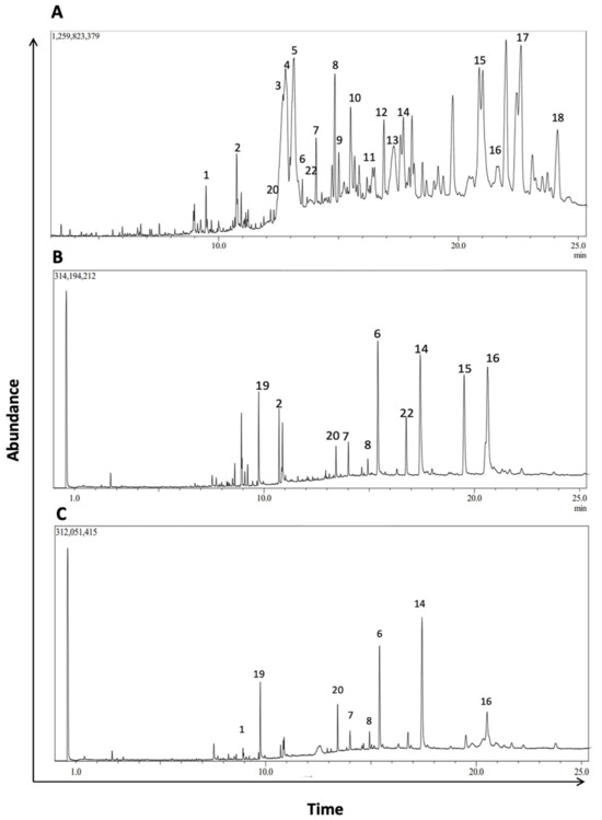 GC/MS chromatogram of M. orbicularis’ parts’ ethanolic extract displaying the elution profile of phytochemicals listed in Table 3. (A) Fruit extracts, (B) leaf extracts, and (C) stem extracts.