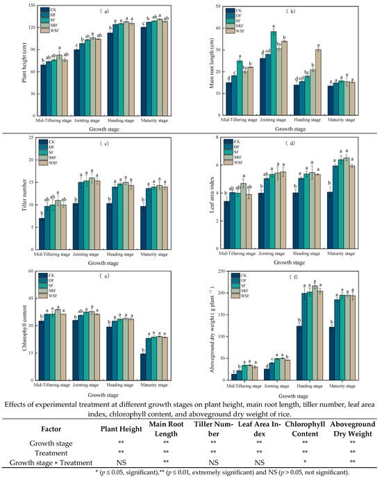 Changes in plant height (a), main root length (b), tiller number (c), leaf area index (d), chlorophyll content (e), and aboveground dry weight (f) during observation. CK: no fertilization; OF: chemical fertilizers based on the medium yield recommended fertilizer amount by testing the soil of formulated fertilization; SF: 4.50 Mg ha−1 straw returning + chemical fertilizers; SRF: 0.59 Mg ha−1 slow-release fertilizer + chemical fertilizers; WSF: 0.60 Mg ha−1 water-soluble fertilizer + chemical fertilizers. Different letters indicating significant differences based on LSD (p < 0.05).