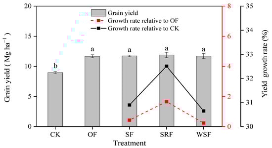 There are significant differences in rice yield and N and P uptake among different treatments (Figure 2 and Table 1). The average grain yield ranged from 8.97 to 11.89 Mg ha−1 for rice. The SF, SRF, and WSF treatments increased rice grain yield by 30.65–32.51%, 0.24–1.66% compared to the CK and OF treatments, respectively. Therefore, straw returning and application of slow-release fertilizer and water-soluble fertilizer combined with fertilizer had significant positive effects on rice yield. However, there was no significant difference in yield among different fertilization treatments (p > 0.05). The yields were in the sequence SRF > SF > WSF > OF > CK. The yield under the SRF treatment was higher than those under the SF, WSF, and OF treatments.
