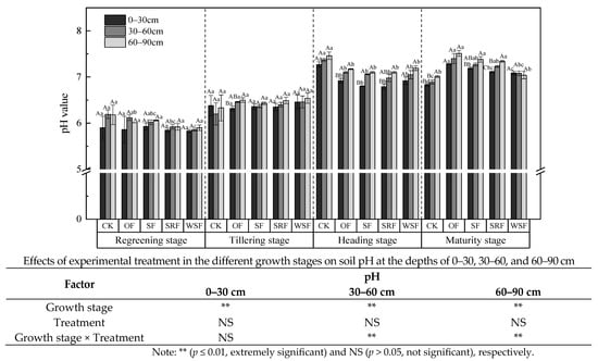 Soil pH value in the regreening, tillering, heading, and maturity stages under five treatments. Different capital letters indicate significant differences at the different soil depths in the same treatment (p < 0.05). Different lowercase letters indicate significant differences between different treatments at the same depth (p < 0.05).