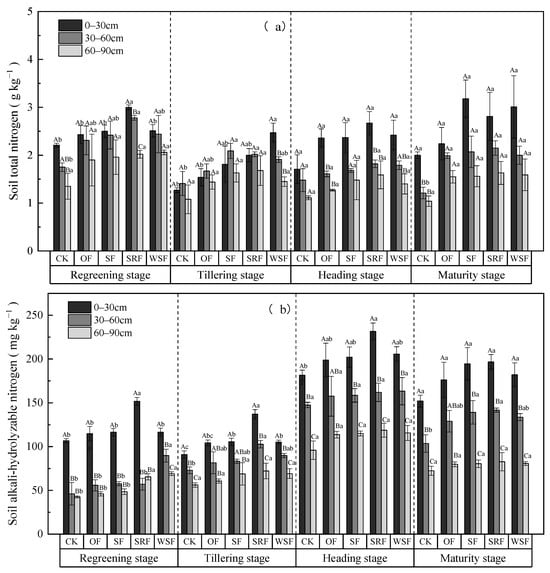 On the other hand, applying slow-release fertilizer improved soil enzyme activity, thus promoting organic decomposition and biological nitrogen fixation and ultimately improving soil fertility [62,63]. Zhang et al. [64] found that straw returning significantly increased soil TN and SOM in both rice growth stages. Compared with chemical fertilizers with the same nutrient level, liquid residue had a better promotion effect on plant growth and soil quality [56]. Generally, in the current study, as the crop advanced from the regreening stage to the maturity stage, soil pH, TN, AN, SOM, AP, and AK increased under SF, SRF, and WSF treatments, while soil NO3−-N and NH4+-N content showed no obvious tendencies among these fertilizer treatments, and NO3−-N content was less than NH4+-N content.