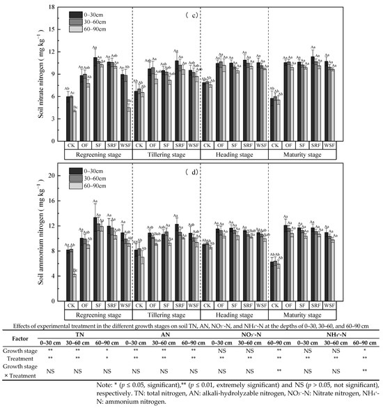 Changes in soil total nitrogen (a), alkali-hydrolyzable nitrogen (b), nitrate nitrogen (c), and ammonium nitrogen (d) during observation. Different capital letters indicate significant differences at the different soil depths in the same treatment (p < 0.05). Different lowercase letters indicate significant differences between different treatments at the same depth (p < 0.05).