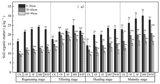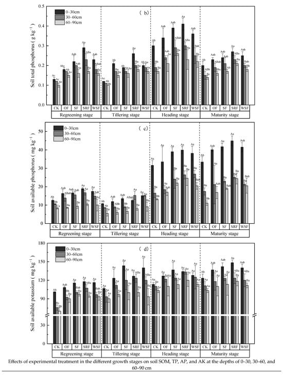 Changes in soil organic matter (a), soil total phosphorus (b), soil available phosphorus (c), and soil available potassium (d) during observation. Different capital letters indicate significant differences at the different soil depths in the same treatment (p < 0.05). Different lowercase letters indicate significant differences between different treatments at the same depth (p < 0.05).