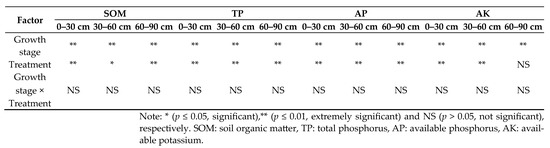 In the Chaohu Lake region, straw returning, slow-release fertilizer, and water-soluble fertilizer are common agronomic measures in agricultural production. However, changes in soil properties caused by these management measures have not been fully studied. Soil properties are generally considered to be the soil’s capacity to maintain soil quality and promote plant productivity [57,58]. In the study, we analyzed the effects of straw returning and new fertilizers substitution on several soil properties (e.g., pH, TN, AN, NO3−-N, NH4+-N, SOM, TP, AP, and AK) at different soil depths during the growth stages of rice. However, soil properties differed substantially among different fertilizer treatments due to large variations in the characteristics of the fertilizers [59]. For example, Ghafoor et al. [60] found that slow-release fertilizer application significantly enhanced soil available N, P, and K contents. The combined application of slow-release fertilizer and chemical fertilizers resulted in higher soil TN, available nitrogen, and SOM content [61].