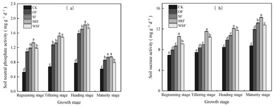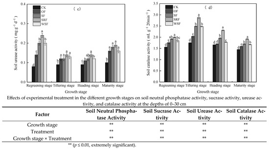 Changes in Soil neutral phosphatase (a), Soil sucrase (b), Soil urease (c), and Soil catalase activity (d) in the 0–30 cm soil depth during observation. Different lowercase letters indicate significant differences among the treatments (p < 0.05).