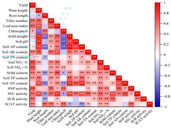 Pearson correlations between rice yield, growth parameters, and soil properties in the 0–30 cm soil depth. Asterisks denote significance at the p < 0.05 and p < 0.01 probability levels (* and **, respectively). Red indicates a positive correlation; blue indicates a negative correlation.