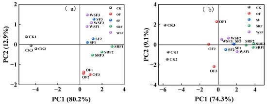 The results of the principal component analysis were shown in Figure 8a,b. Using rice yield and growth indexes as original variables, the principal component analysis method revealed that the first principal component axis (PC1) and the second principal component axis (PC2) explained 93.1% of the variation, the contribution rate of the PC1 was 80.2%, and the contribution rate of the PC2 was 12.9%. In contrast, using rice yield and soil indices as original variables, the results showed that PC1 and PC2 axes explained 83.4% of the variation. On the other hand, rice yield and growth parameters were substantially affected by slow-release fertilizer, straw returning or water-soluble fertilizer, and chemical fertilizers treatments. The contributions between rice yield and growth parameters, and soil properties among all the treatments in this study were all ranked as the following sequence: SRF > SF > WSF > OF > CK treatment in 0–30 cm soil.