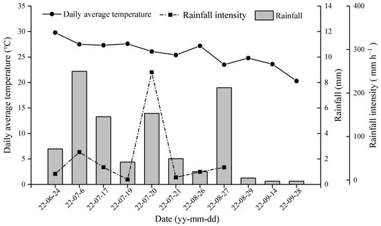 The experimental site is located in Tongyang Town (31°41′24″ N, 117°37′12″ E), Anhui Province, China. The area is characterized by a subtropical humid monsoon climate, with an average temperature of 15.7 °C and an annual rainfall of 1215 mm. The soil type is paddy soil. The Initial soil physical and chemical properties are shown in Table 2. The daily average temperature and rainfall during the growing period of rice in the study area are shown in Figure 9.