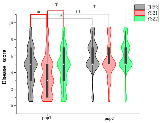 The violin plot of phenotypic distribution of RILs for pop1 and pop2 to BLSB response in three different environments (JH22, YS21, YS22). The asterisk above indicates the result of Student’s t test, * represents p < 0.05, ** represents p < 0.01.