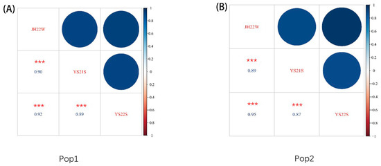 Correlation of pop1 and pop2 to BLSB response across three environments. (A) Correlation of pop1 to BLSB response between the JH22, YS21, and YS22 environments; (B) correlation of pop2 to BLSB response between the JH22, YS21, and YS22 environments. *** indicates p < 0.001.